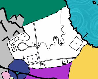 New Meridian is approximately 35 miles by 27 miles in area. The coastline to the east is approximately 19 miles long. Only the main road north-south and east-west are on the map, as well as Silk Road (curving and narrow) turning into the Dark Way (straight and narrow) at it's northmost end, and the loop road in the Government Quarter. All alleys and other minor streets are left ambiguous so that players can use/create them as they see fit. The area north of Silk Road is considered residential: more upper-class near the north-south road, and more lower-class towards the Telern border and the Dark Way. South and east of Silk Road is the shopping district, ranging from high-end boutiques to your average mom-and-pop discount store.
