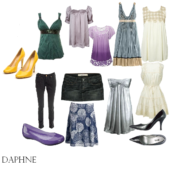 Daphne loves dresses and skirts. If she wears jeans, they're skinny jeans and her shirt is floaty. She likes deep colors, or pastels, never bright. Unless of course, it's in shoes or necklaces or bracelets.