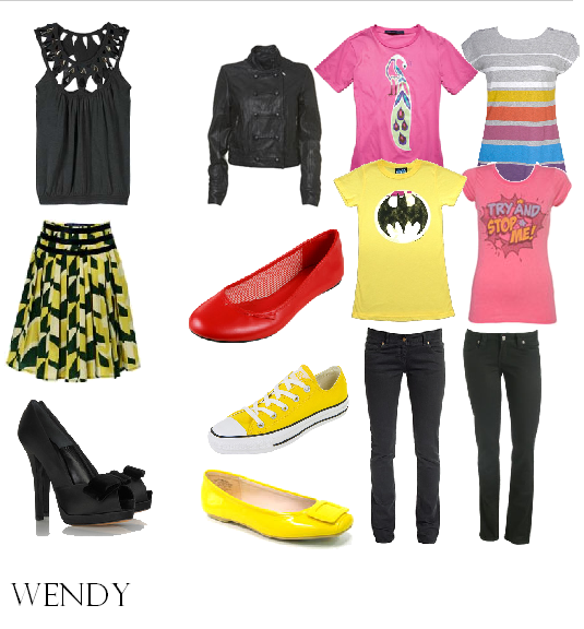Wendy never wears skirts, except on special occasions. Her shoes are all yellow or red, except for her pair of black heels, also reserved for special occasions. She also has an assortment of yoga clothing, but she doesn't wear that in public. Not generally.