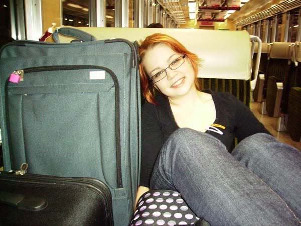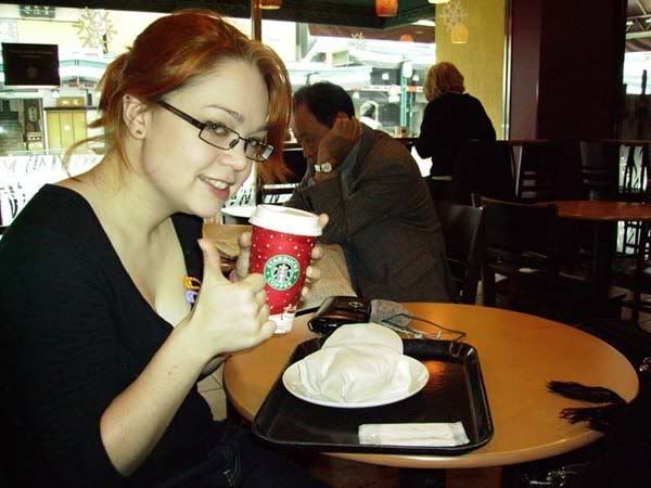 Sally in Starbucks at breakfast.Let me tell you now that cramming three large suitcases, two hefty carry-on bags and three people into one tiny set of four opposing seats is a very interesting experience in itself, and certainly not my preferred way of travelling. Unfortunately it was the best we could do given that we’d already paid for our ticket and so we passed the time by listening to music (in Sally’s case) and various Dane Cook skits (in Nat’s and mine) whilst watching the scenery change yet again and more of Japan zipped by outside the train.