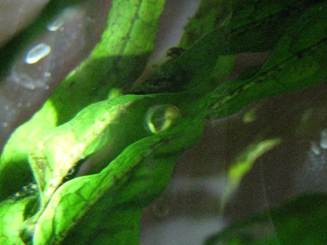 | ...and then it may. Below is a fuzzy picture of a tiny little baby newt inside a newt egg. It's in the middle of the picture. Most of the eggs are rolled into leaves, so you can't take a picture of them at all; this one is between two leaves of a Java fern. I have put the plants that have eggs in them in two small tanks, so no one gets to eat the eggs or the larvae; there are about 10 eggs in there, maybe more. They are about two or three mm in size; that is slightly smaller than a grain of black pepper, a bit like the size of a coriander seed, maybe even smaller than that. It's not uncommon for the eggs to die and get moldy in this stage, so I'm not counting on any results, but so far, all the eggs that I can see appear to be doing fine. I've been watching the dots inside them grow for a couple of days weeks now. I've decided to try to raise the larvae. It's fairly complicated but I'll just give it my best shot and see how far we get. Isn't it exciting? | |