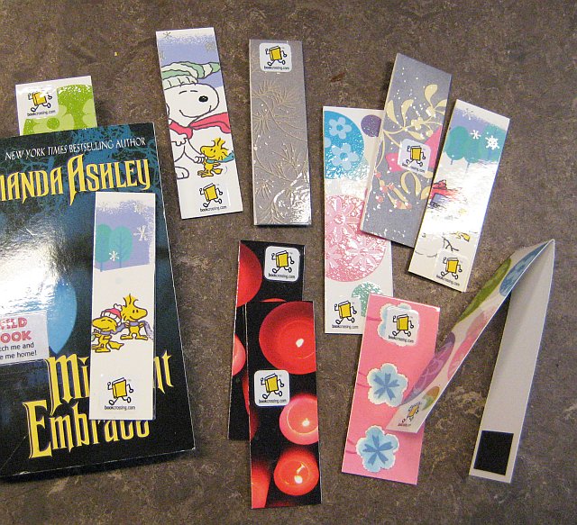 | I've recycled some of my used greeting cards into magnetic bookmarks, using some magnetic tape, Tiny Stickers from the BC Supply Store and a bit of packing tape for extra shinyness and durability. See what you think. The nice thing about these is that the magnetic tape makes them snap shut (ever so slightly) around the page so they never slide out of your book.  Click for larger size. | |