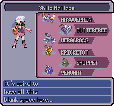 All things considered, I'm pretty psyched about the sprites. I wanted Shilo to have more ghost POKEMANZ, but Shuppet was the only one that seemed appropriate. Besides, GR got all the good ones. Or...all the...ones because...come on, Drifloon. (Note: Shilo totally caught Clefairy for him because she thought it'd be hilarious.)